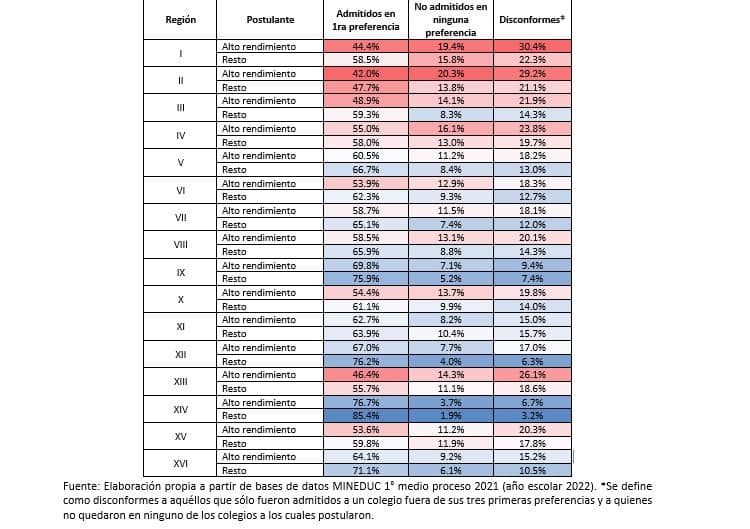 Estos porcentajes de éxito en la postulación, sin embargo, varían entre regiones, aunque en todas se mantiene que los alumnos de alto rendimiento tienen menos chances de acceder a los establecimientos de su primera preferencia. Con todo, tal como muestra la Tabla 1, es en las regiones del norte del país (Tarapacá, Antofagasta y Atacama), así como en la Metropolitana, donde los postulantes de alto rendimiento obtienen un peor resultado, quedando incluso menos de la mitad de ellos en su primera opción.
