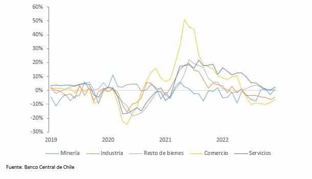 Por actividad, Comercio e Industria cayeron 6,4% y 5% respectivamente, resultado que fue compensado en parte por el desempeño positivo de Servicios (2,3%), como se observa en el siguiente gráfico.