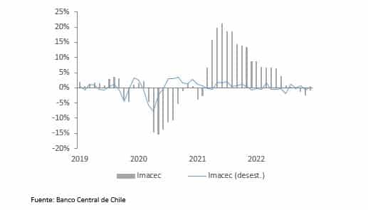 Con todo, la actividad económica creció preliminarmente 2,7% en 2022, cifra superior a lo proyectado, donde se observa un primer semestre creciendo al 6,5%, mientras que en la segunda mitad del año con una contracciòn de -0,7%, con registros negativos en los últimos cuatro meses, llevando a la economia chilena a un estado recesivo, en donde ya el mercado del trabajo ha dado señales de debilidad en la creaciòn de empleo.