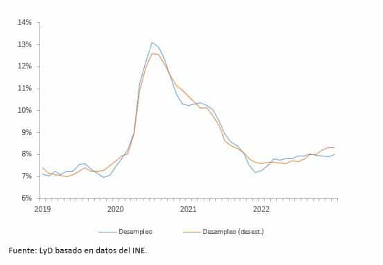 El Instituto Nacional de Estadísticas (INE) dio a conocer la tasa de desocupación nacional correspondiente al trimestre noviembre 2022 - enero 2023, la cual se ubicó en 8,0%, incrementándose 0,8 pp. en 12 meses. La cantidad de personas desocupadas aumentó 15,2%, la mayor expansión desde el trimestre enero - marzo 2021. Por su parte, el crecimiento de los ocupados continúa desacelerandose, aumentando solo 3,4% en esta última medición.
