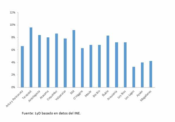 En este trimestre pudimos ver un aumento del desempleo en 10 regiones y una reduccion en 4, mientras que en dos regiones se mantuvo. Tarapacá lidera la tasa de desocupación con un registro de 9,6%. Le sigue la Región Metropitana -la cual concentra el 45% de la fuerza laboral-, con un registro de 9,2%. En contraste, las regiones con menor tasa de desempleo fueron Los Lagos y Aysen, con registros de 3,3% y 4,0%, respectivamente.