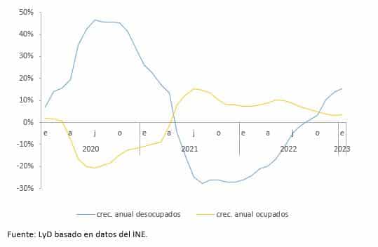 En conclusión, si bien el empleo que se genera estacionalmente en esta fecha modera el impacto de la recesión sobre la tasa de desempleo, se puede ver que en 12 meses, el ritmo de crecimiento de los desocupados va al alza y el de los ocupados a la baja, lo que da cuenta de un desequilibrio creciente en el mercado del trabajo en respuesta a la contracción de la producción por la cual atraviesa la economía chilena.