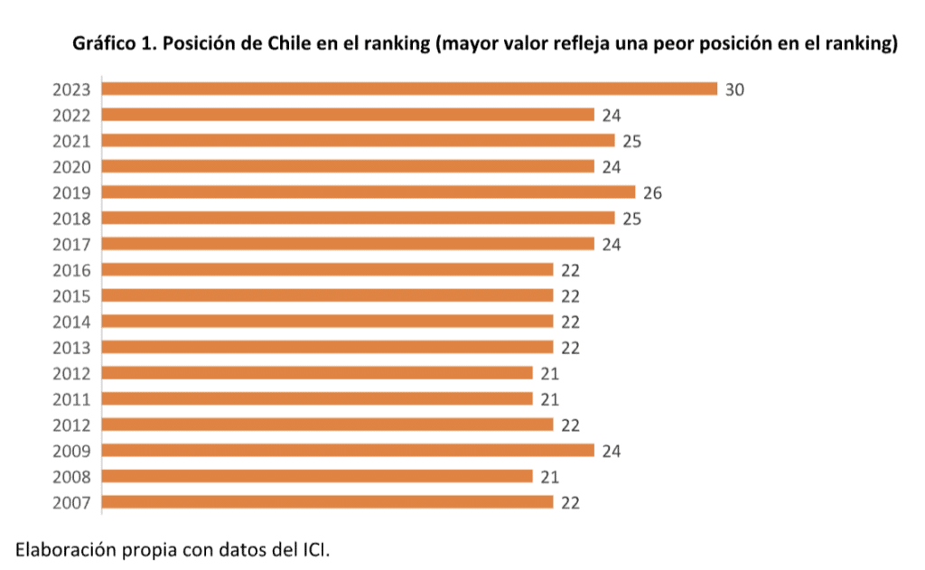 El índice, que pondera la posición relativa de los países en ocho indicadores de gran reputación mundial y que se elabora desde el año 2007, ubica a Chile en el puesto 30 de 183 países, lo que implica un retroceso de seis puestos con respecto a la medición de 2022, la mayor caída en la historia del índice. Con esto, hoy en día el país se encuentra a 9 lugares de su mejor posición alcanzada en los años 2008, 2011 y 2012, como se observa en el Gráfico N°1.