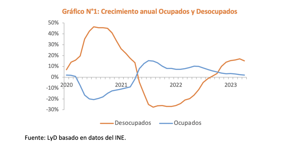 La cantidad de personas desocupadas aumentó 15,1% en 12 meses, lo que significa un crecimiento de 112 mil personas que buscan trabajo y no encuentran. Al mismo tiempo, el crecimiento de los ocupados continúa desacelerandose, aumentando solo 1,9% en esta última medición como se puede observar en el Gráfico N°1. Por último, la fuerza de trabajo sigue al alza, esta vez con un incremento anual de 3%.