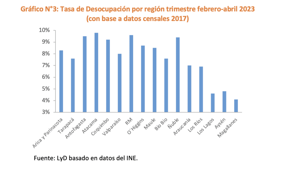 En este trimestre pudimos ver un aumento anual del desempleo en 11 regiones, donde la mayor alza la exhibió la Región del Maule (3,5 pp.) y una reduccion en 5 regiones. Atacama, lidera la tasa de desempleo con un registro de 9,8%, seguido por la Región Metropolitana (9,6%) y Ñuble (9,4%). En contraste, la regiones con menor tasa de desempleo fueron Magallanes y Los Lagos, con registros de 4,1% y 4,6%, respectivamente.
