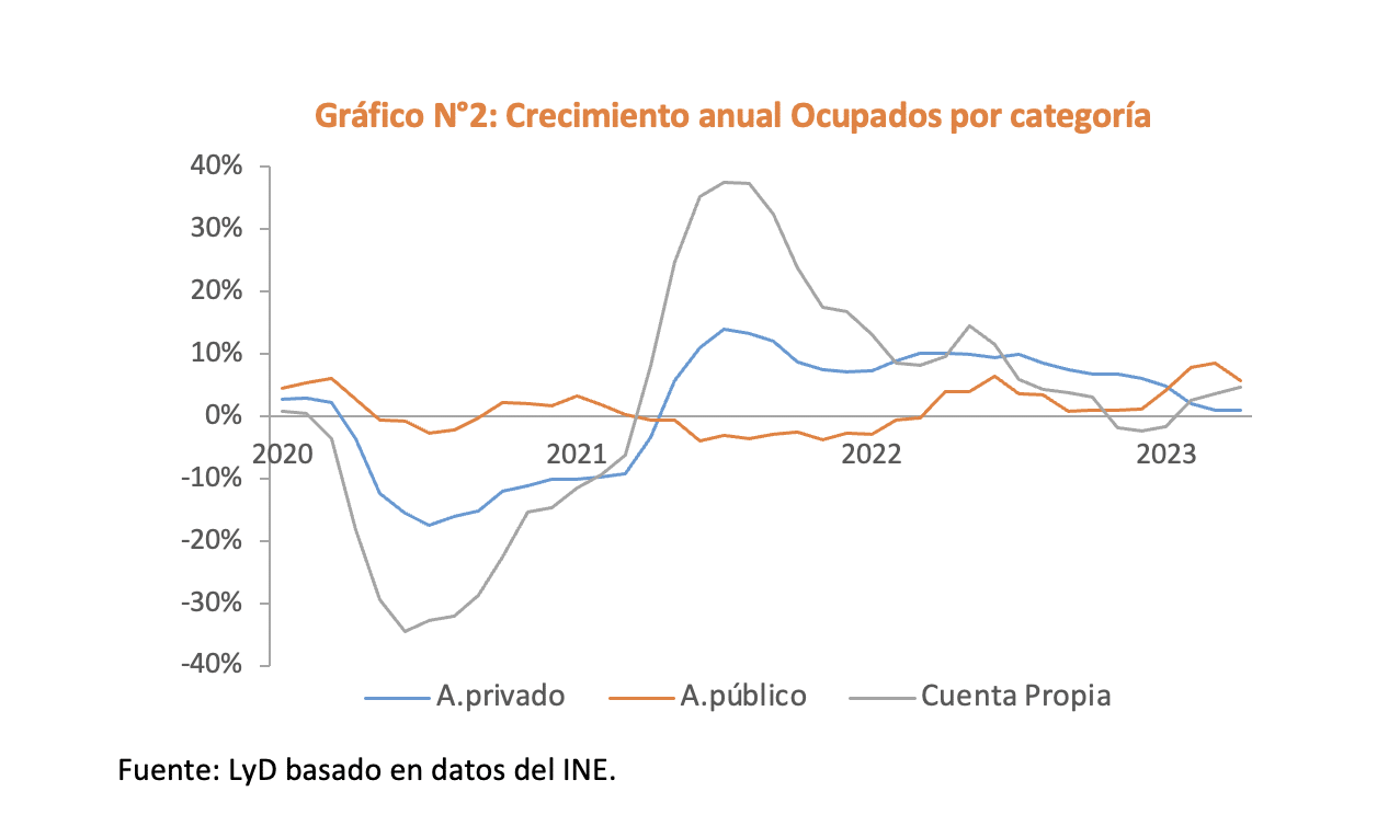 En esta medición se crearon apenas 171 mil puestos de trabajo con respecto al mismo trimestre del año anterior, de los cuales 48% corresponden a trabajadores por cuenta propia y un 37% a asalariados del sector público. En el Gráfico N°2 se puede ver un aumento en la creación de empleos en el sector público y por cuenta propia en 2023, mientras en el sector privado se ha ido desacelerando, en línea con la recesión económica.