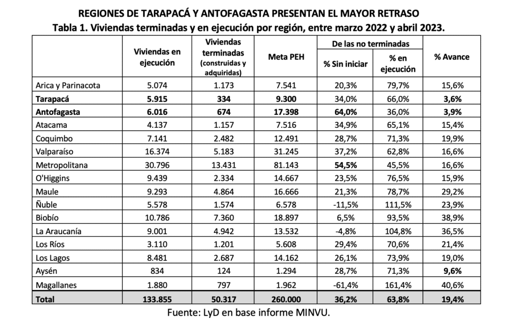 Luego, se observa que son las regiones de Tarapacá y Antofagasta las que siguen presentando el mayor retraso. La Tabla 1 muestra que las regiones de Tarapacá y Antofagasta presentan respectivamente un 3,6% y 3,9% de avance. Preocupa especialmente la región de Antofagasta, donde 64% de las viviendas no ha iniciado.