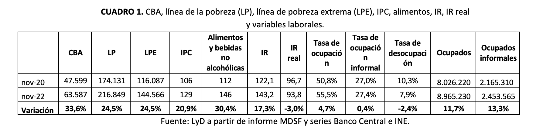 1. Pérdida del poder adquisitivo de los hogares. Desde la última estimación oficial de la pobreza, en noviembre de 2020 y noviembre 2022, el aumento de la CBA ha sido mayor que el Índice de Precios al Consumidor (IPC) y que el índice de remuneraciones (IR), es decir, existe una importante pérdida en el poder adquisitivo de las familias durante ese periodo (ver Cuadro 1).
