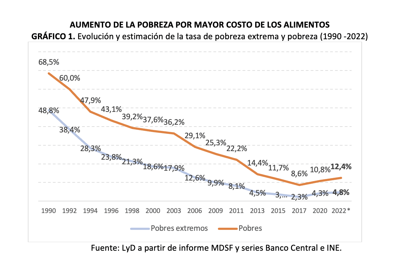 Se observa que el aumento en la pobreza que proviene de la pérdida del poder adquisitivo ubicaría a la tasa en un 12,4%, es decir, habrían más de 300 mil personas en pobreza. Mientras que la tasa en pobreza extrema se ubicaría en un 4,8% (Gráfico 1). Este ejercicio deja en evidencia como la inflación tiene efectos muy nocivos en el bienestar de las personas y perjudica a la población con menos recursos.