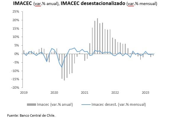 El Banco Central de Chile dio a conocer el IMACEC de abril 2023, que se contrajo 1,1% en comparación con igual mes del año anterior, mayor a la caída que proyectaba el mercado, sumando tres períodos consecutivos de bajas en la actividad económica. La serie desestacionalizada, por su parte, no presentó variación con respecto al mes previo. El mes registró un día hábil menos que abril de 2022.