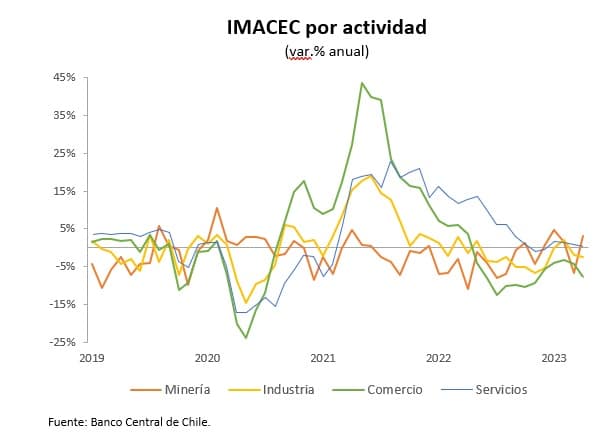 Si desagregamos el IMACEC entre minero y no minero, se tiene que el primero creció 3,1% en términos anuales, mientras que la actividad no minera se contrajo 1,6%. En el caso de este último incidió la caída del comercio (-7,7) y en menor medida, de la industria (-2,5%).