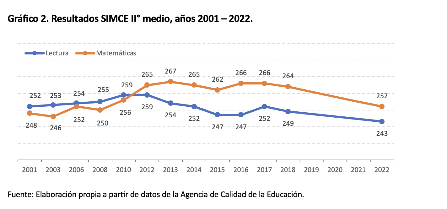 Lamentablemente, los resultados mostraron un retroceso en los promedios nacionales en 4° básico y II° medio, especialmente en la prueba de Matemáticas –con caídas de 10 y 12 puntos, respectivamente-, así como una persistencia en las brechas entre establecimientos de nivel socioeconómico alto y bajo. De esta forma, como se observa en el Gráfico 1, a nivel de 4° básico se registra un retroceso de 6 años en Lectura y de 9 años en Matemáticas, mientras que el Gráfico 2 muestra que la situación para II° medio es aún más negativa, reportándose un retroceso de 14 años en Lectura y el peor promedio en Matemáticas desde que se rinde la prueba. A lo cual se debe sumar la preocupante falta de información relativa a las tres generaciones anteriores, cuyo desempeño desconocemos debido a la mencionada suspensión de las pruebas en los años previos.