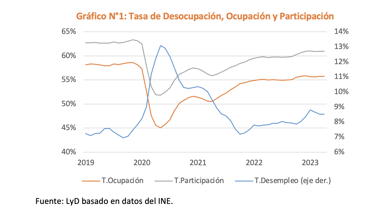 El Instituto Nacional de Estadísticas (INE) dio a conocer la tasa de desocupación nacional correspondiente al trimestre móvil abril-junio 2023, la cual se ubicó en 8,5%, incrementándose 0,7 pp. con respecto al mismo trimestre del año anterior. Por su parte, la tasa de ocupación (que corrije por el crecimiento de la población) y participación crecen levemente en 12 meses pero permanecen relativamente constantes en las últimas mediciones (Gráfico N°1).