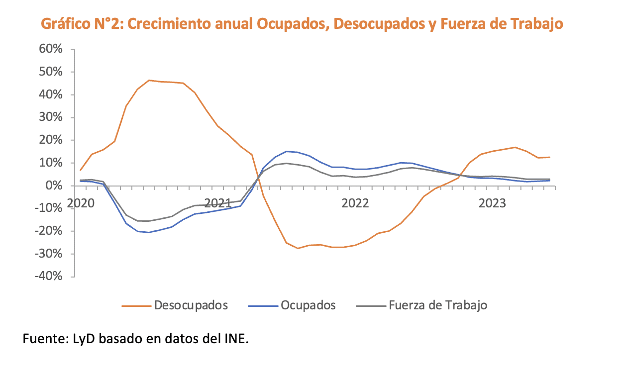En el trimestre abril-junio 2023, la cantidad de personas desocupadas aumentó 12,5% en términos anuales, lo que significa un crecimiento de 93 mil personas que buscan trabajo y no encuentran. Similar al mes anterior, el crecimiento de los ocupados fue de apenas 2,2%, donde construcción continúa registrando una fuerte destrucción de puestos de trabajo, en línea con el descenso de la producción. Por último, la fuerza de trabajo registró un incremento anual de 3% (Gráfico N°2).