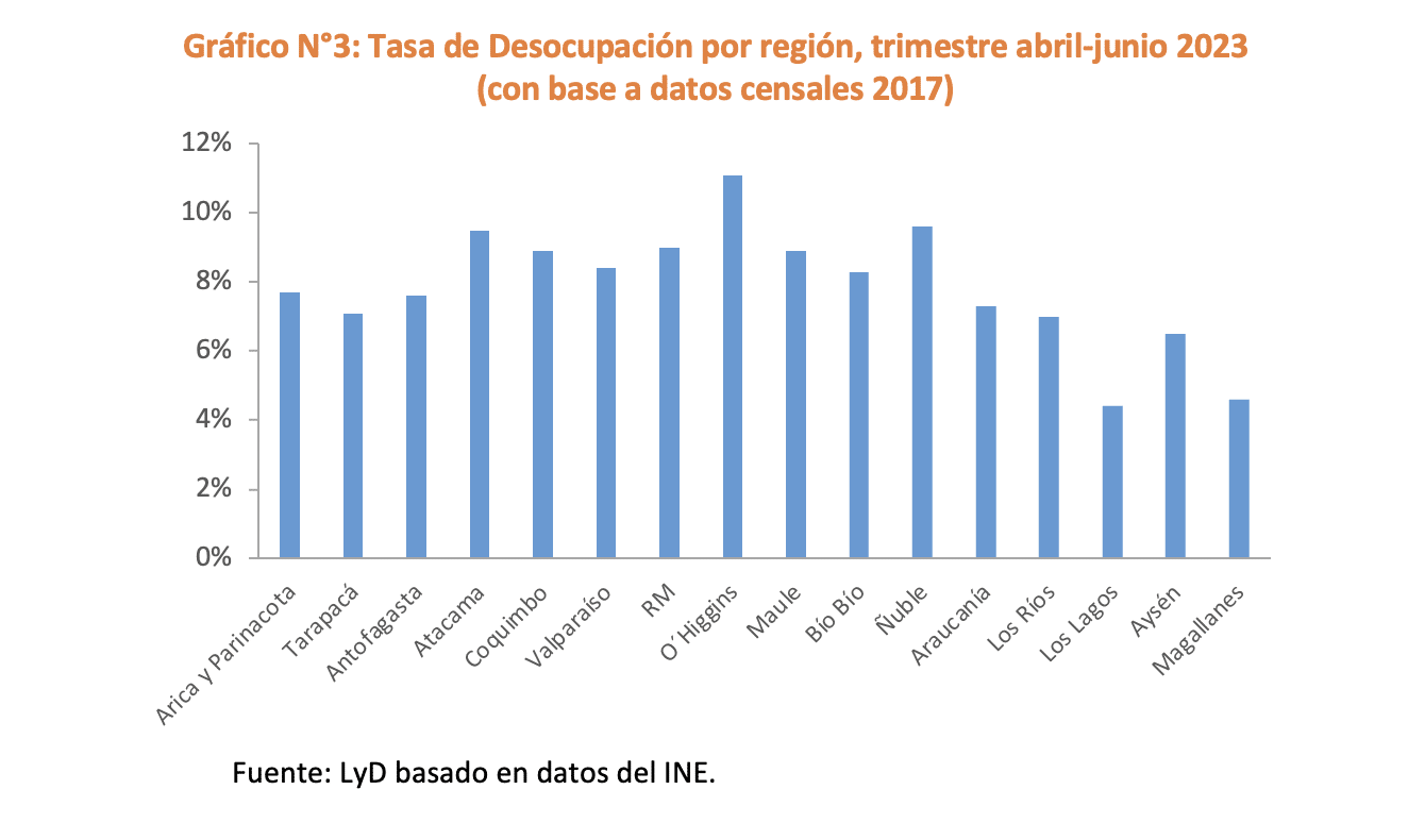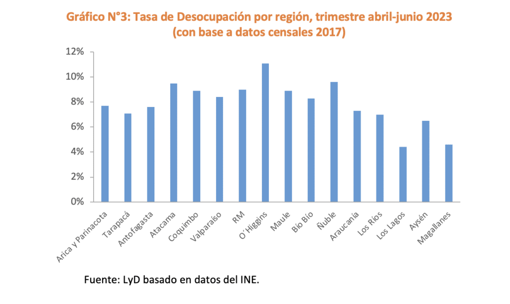 En este trimestre pudimos ver un incremento anual del desempleo en 12 regiones, donde la mayor alza la exhibió la Región de O’Higgins (3,1 pp.) y una reducción en 4 regiones. O’Higgins, lidera la tasa de desempleo con un registro de 11,1%, seguido por Ñúble (9,6%) y Atacama (9,5%). En contraste, la regiones con menor tasa de desempleo fueron Los Lagos y Magallanes, con registros de 4,4% y 4,6%, respectivamente.
