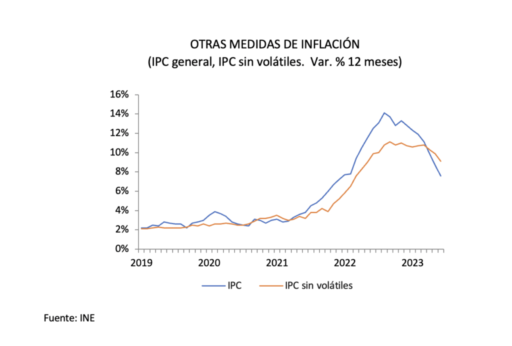 Respecto a mayo, el IPC sin volátiles no presentó variación, sin embargo, en 12 meses registra un alza de 9,1% como se observa en el siguiente gráfico. Al igual que en Estados Unidos, el IPC sin volátiles permanece en niveles altos y muestra una trayectoria descendente de menor magnitud que el IPC general y el resto de las medidas.