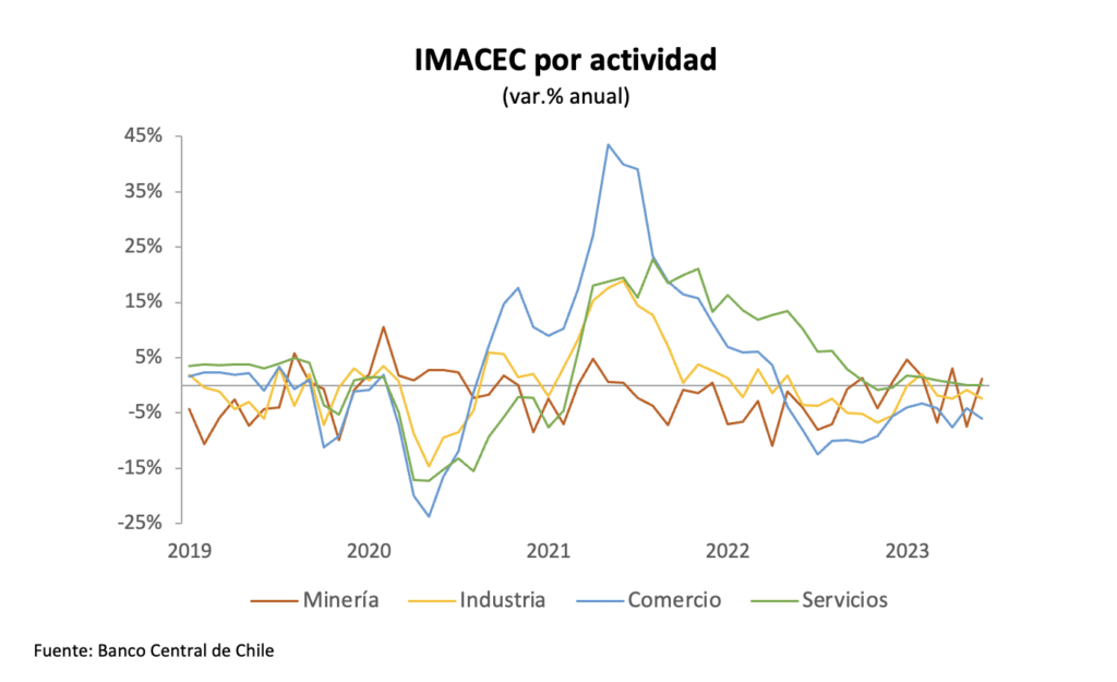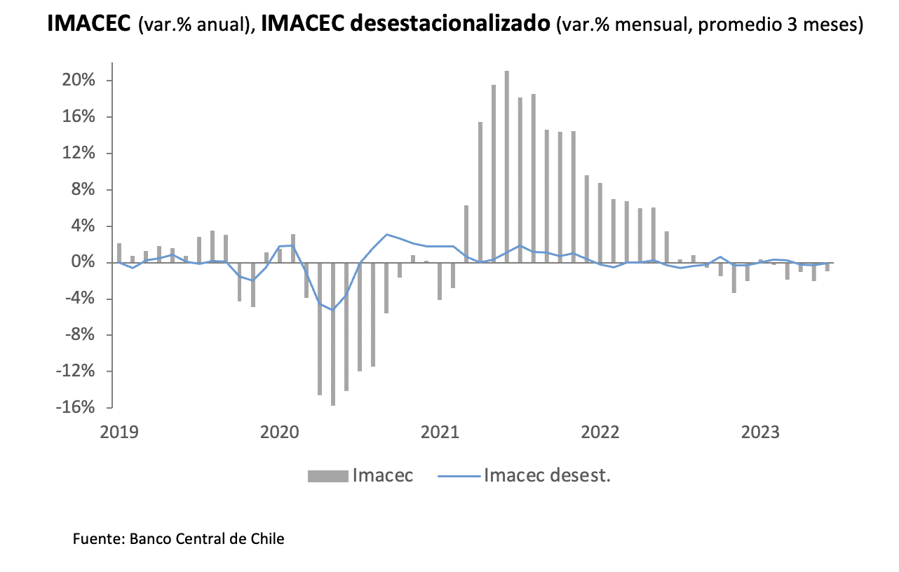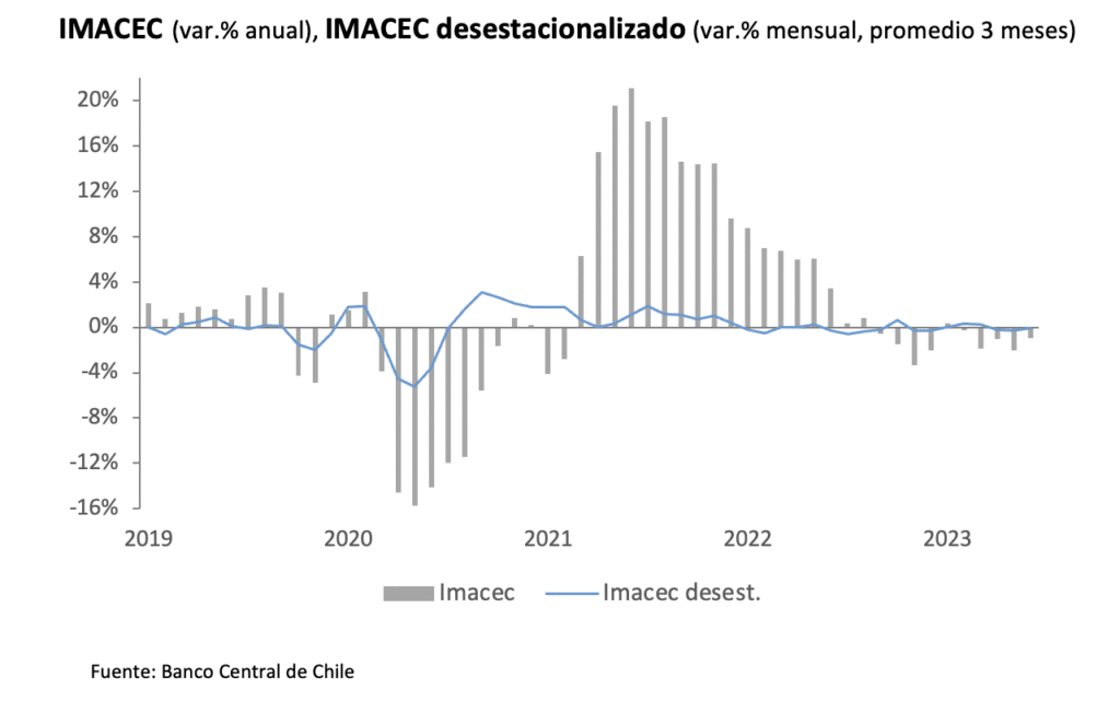 El Banco Central de Chile dio a conocer el IMACEC de junio 2023, que se contrajo 1% en comparación con igual mes del año anterior, sumando cinco períodos consecutivos de bajas en la actividad económica. El resultado estuvo explicado por la caida del comercio y la industria, aunque fue menos negativo de lo esperado. La serie desestacionalizada, por su parte, aumentó 0,5% con respecto al mes previo, por el desempeño de la minería.
