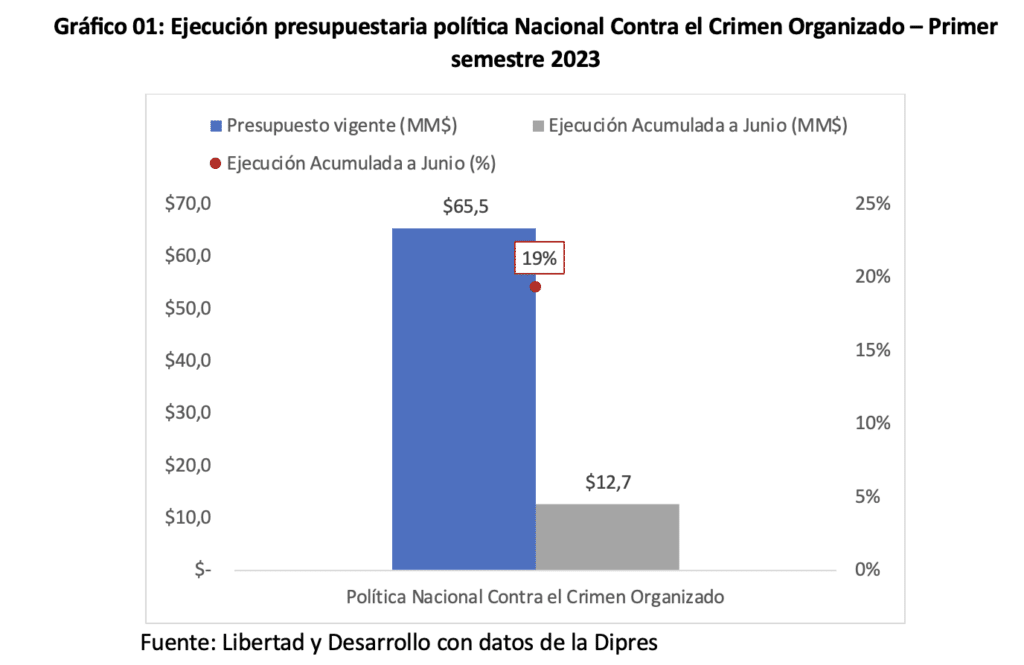 Los informes de la Dipres para el primer semestre de este año nos indican que la Política Nacional Contra el Crimen Organizado, que fue el principal anuncio del gobierno en materia de seguridad durante discusión presupuestaria, ha ejecutado apenas un 19% de sus recursos disponibles y de estos, no se ha destinado ni un solo peso de los comprometidos a renovar el parque vehicular de Carabineros.