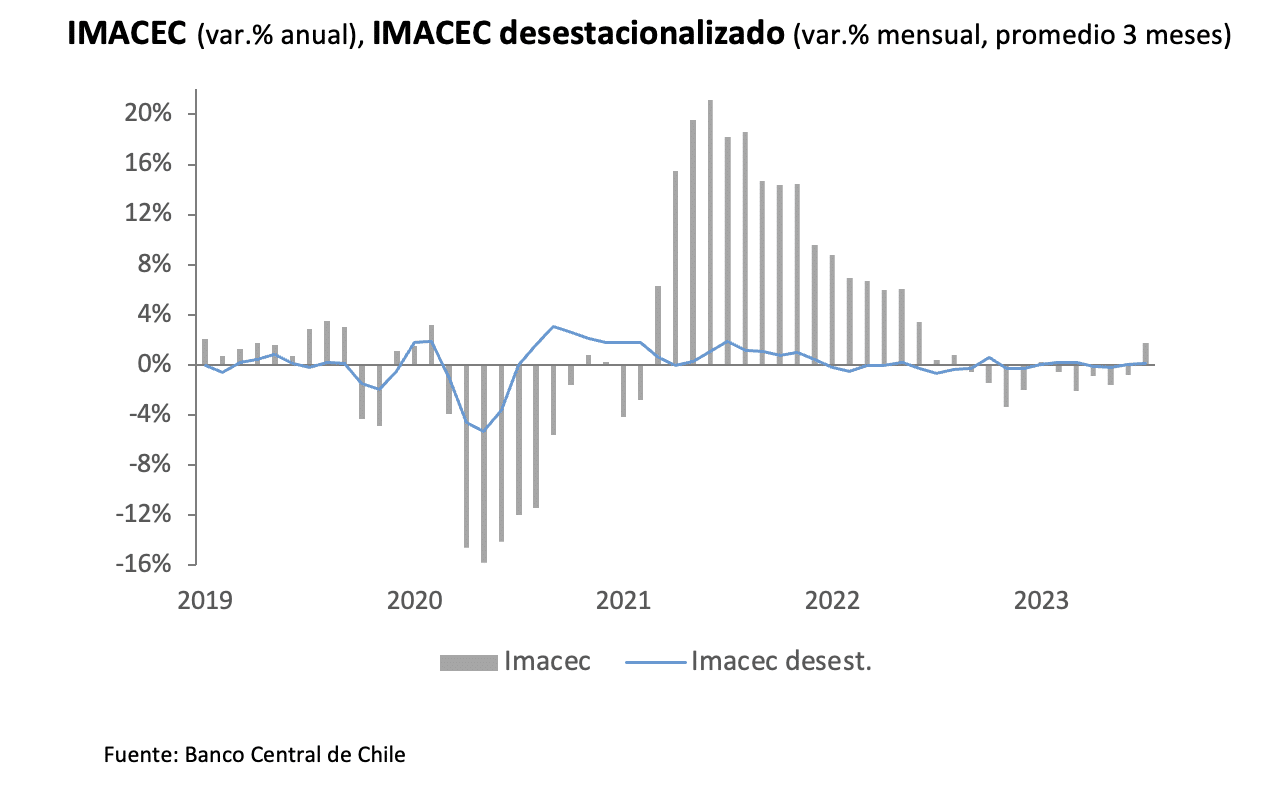 El Banco Central de Chile dio a conocer el IMACEC de julio 2023, que tuvo un incremento de 1,8% en comparación con igual mes del año anterior, luego de cinco períodos consecutivos de bajas en la actividad económica. El resultado fue explicado por el desempeño de servicios y la minería, y estuvo muy por sobre lo esperado por el mercado. La serie desestacionalizada, por su parte, aumentó 0,3% con respecto al mes previo.