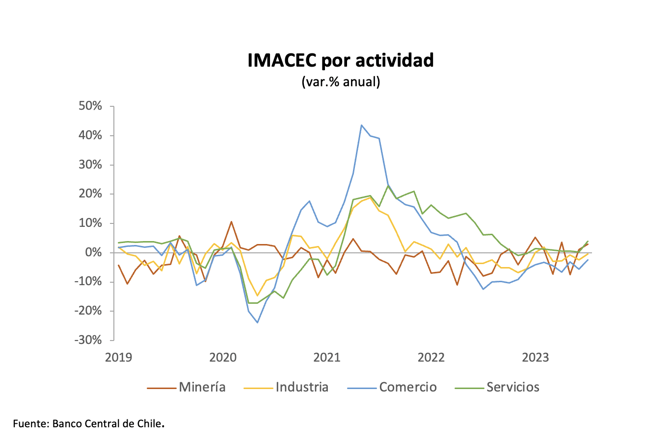 El Banco Central de Chile dio a conocer el IMACEC de julio 2023, que tuvo un incremento de 1,8% en comparación con igual mes del año anterior, luego de cinco períodos consecutivos de bajas en la actividad económica. El resultado fue explicado por el desempeño de servicios y la minería, y estuvo muy por sobre lo esperado por el mercado. La serie desestacionalizada, por su parte, aumentó 0,3% con respecto al mes previo.