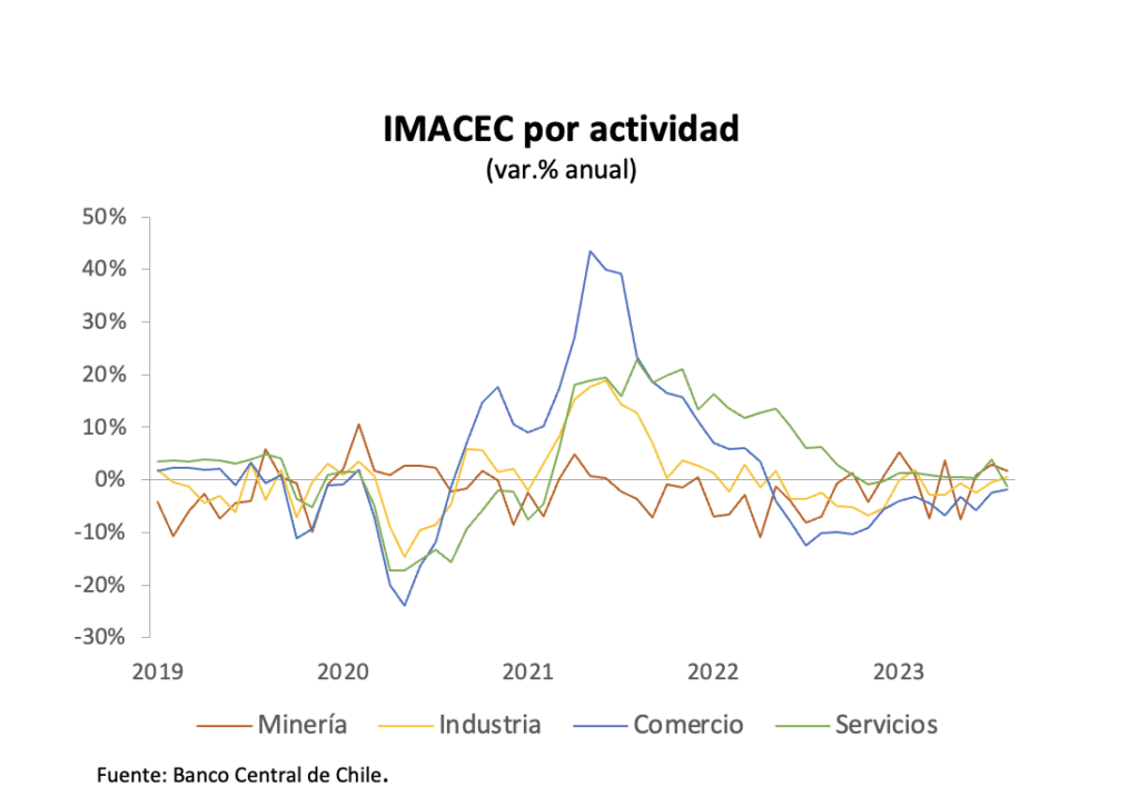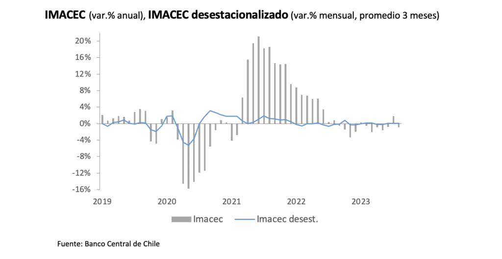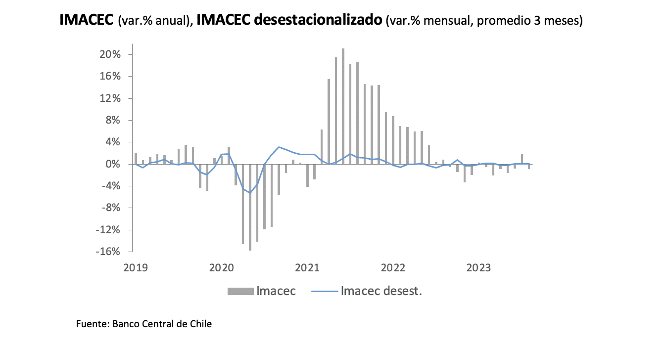 El Banco Central de Chile dio a conocer el IMACEC de agosto de 2023, que cayó 0,9% en comparación con igual mes del año anterior, retomando los períodos de bajas en la actividad económica previos al resultado de julio. El resultado fue explicado principalmente por la baja en servicios y sorprendió negativamente al mercado, que esperaba un registro levemente positivo luego de las cifras sectoriales publicadas el viernes por el INE. La serie desestacionalizada, por su parte, disminuyó 0,5% con respecto al mes previo.