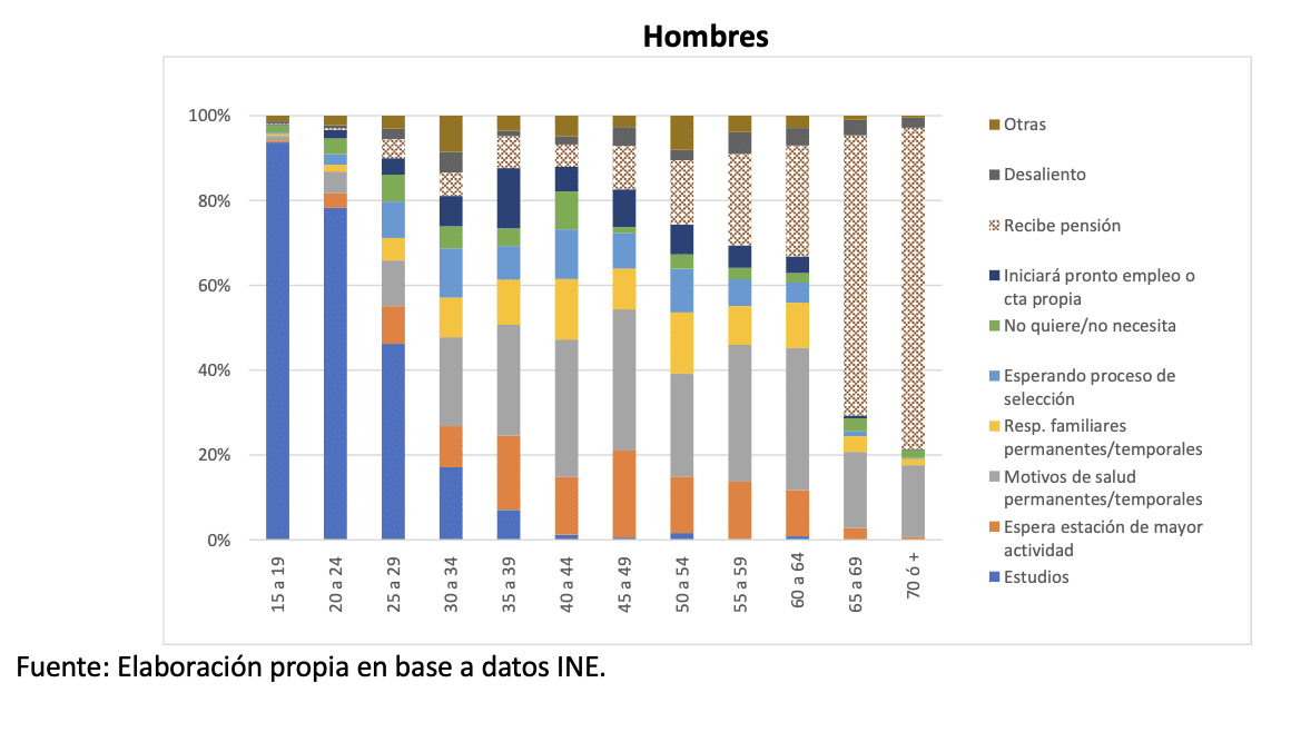 Más en detalle, en hombres, el 94% de quienes tienen entre 15 y 19 años, tiene como razón principal el estudio, proporción que disminuye a 17% a medida que se acercan a los 34 años. Para el 29% de las personas entre 35 y 54 años la causa principal para estar inactivo son los motivos de salud, mientras que el 16,3% de este grupo etáreo declara estar esperando la estación de mayor actividad. De quienes están por sobre los 55 y los 64 años, el 33% tiene motivos de salud para estar inactivo mientras que el 24% recibe una pensión, causa que toma más relevancia a medida que la edad aumenta. Así, el 76% de quienes tienen 70 años y más recibe una pensión, seguido por un 17% que tiene motivos de salud.