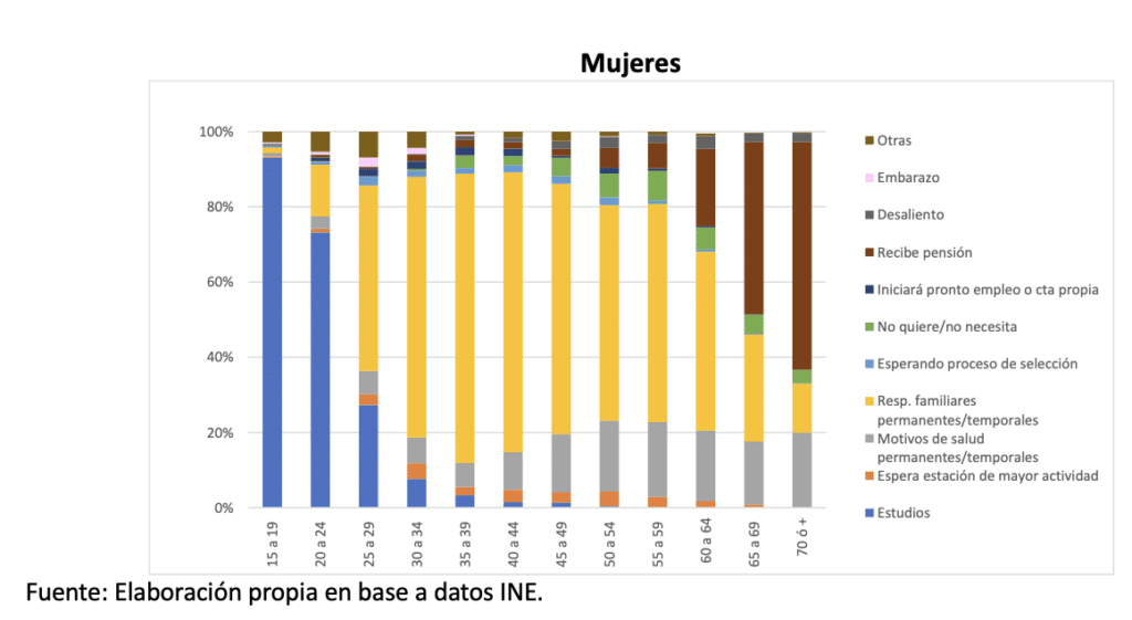 Por otro lado, el 94% de las mujeres entre los 15 y 19 años declara como razón principal los estudios, porcentaje que disminuye fuertemente a partir de los 25 años, cuando las responsabilidades familiares toman más relevancia. Así, para el 61% de las mujeres entre los 25 y 64 años ésta se mantiene como la causa principal de la marginación de la mujer del mercado del trabajo, llegando a ser el motivo del 76% de quienes tienen entre 35 y 44 años. Aunque ya a partir de los 60 años comienza a tomar más importancia, sólo a partir de los 65 años el recibir una pensión pasa a ser el principal motivo para estar fuera de la fuerza laboral. Esto último coincide con que el otorgamiento de la PGU es al cumplir los 65 años y no al momento de cumplir la edad de jubilación.