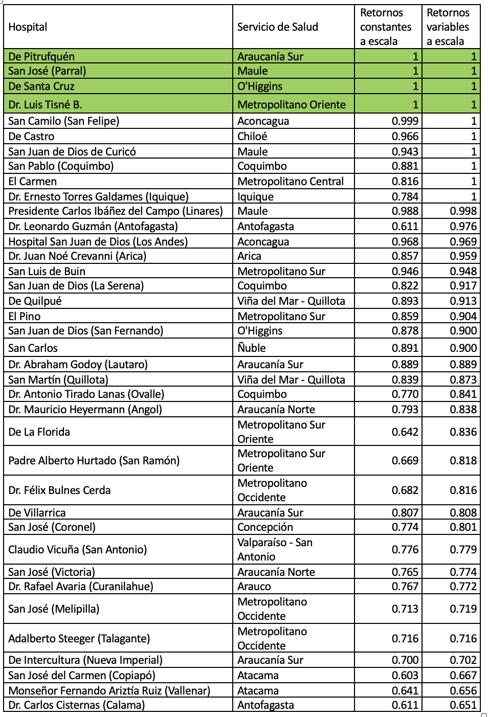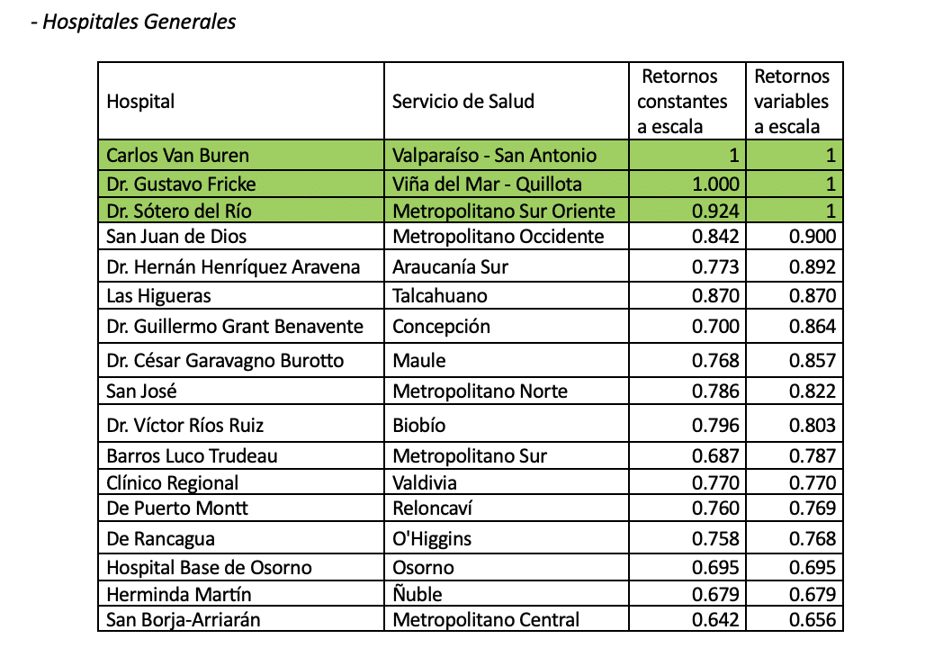 - La frontera eficiente está conformada por cuatro hospitales, al considerar retornos constantes a escala y por diez utilizando retornos variables a escala. Estos establecimientos son: Hospital de Santa Cruz, Hospital de Parral, Hospital de Pitrufquén, Hospital Santiago-Oriente Dr. Luis Tisné, Hospital San Camilo de San Felipe, Hospital de Castro, Hospital de Curicó, Hospital San Pablo de Coquimbo, Hospital de Villarrica y Hospital de Iquique. Siendo los primeros cuatro, parte de la frontera con ambos métodos.