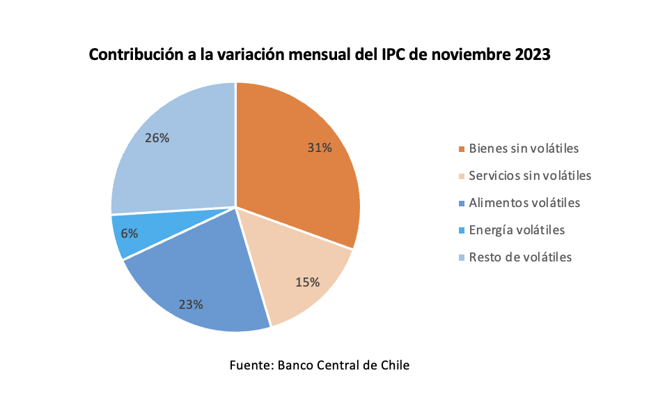 El 45% restante estuvo explicado por el IPC sin volátiles, que aumentó 0,5% con respecto a octubre. Si bien este registro es mayor al promedio histórico para este mes, esto se debió en su mayoría al alza de bienes no volátiles por el efecto rebote luego de las liquidaciones de octubre, como fue el caso de muebles, vestuario, entre otros productos, que presionaron al alza el IPC de noviembre.