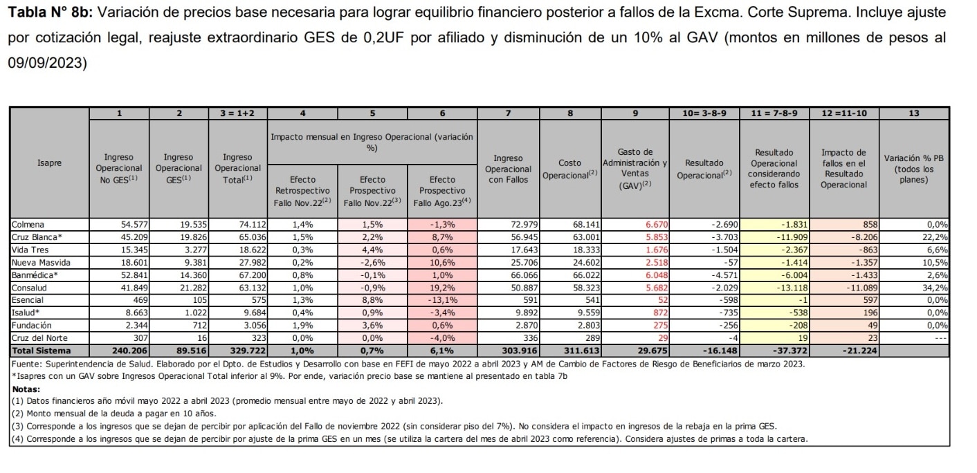 Cabe recordar que previamente la Comisión Técnica Asesora para la Comisión de Salud del Senado en el marco de la discusión de la ley corta, que entregó su informe en octubre de 2023, había estimado cuánto debiera subir el precio base para retomar el equilibrio financiero.