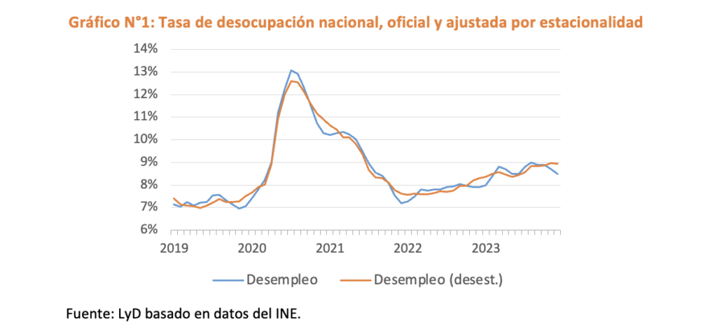 El Instituto Nacional de Estadísticas (INE) dio a conocer la tasa de desocupación nacional correspondiente al trimestre móvil octubre-diciembre 2023, la cual se ubicó en 8,5%. Si bien esta cifra es menor a la de la medición anterior, se debe principalmente al mayor dinamismo histórico del sector agrícola y del comercio en los últimos meses del año y no a una mejora evidente del mercado laboral. De hecho, ajustando por estacionalidad, el desempleo permanece en niveles cercanos a 9% (Gráfico N°1).