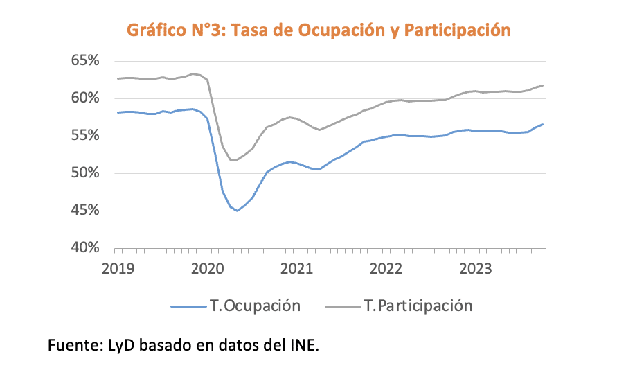 Del lado positivo, tal como se observa en el Gráfico N°3, se consolida una leve tendencia al alza en la tasa de ocupación y participación, que en octubre-diciembre 2023 llegaron a 56,6% y 61,8%, respectivamente, luego de estar practicamente estancadas durante casi todo el año pasado.
