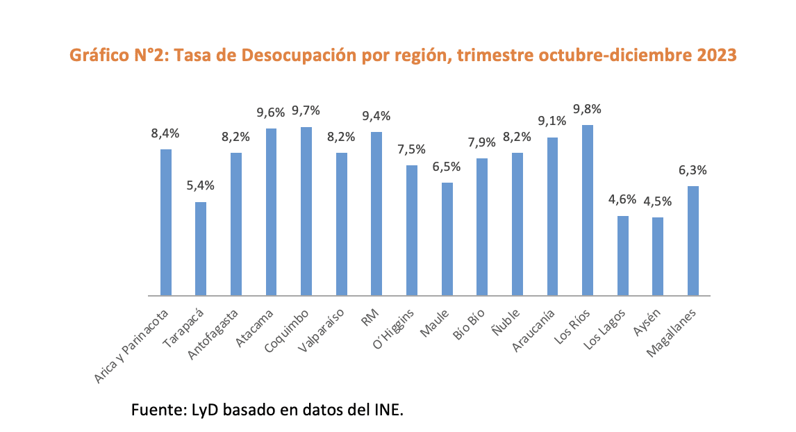 La Región de Los Ríos, registra la mayor tasa de desempleo (9,8%), seguido por Coquimbo (9,7%), Atacama (9,6%) y la Región Metropolitana (9,4%), como se puede notar en el Gráfico N°2. Con respecto al trimestre anterior, las mayores bajas del desempleo fueron en la VI y VII región, lo cual es consistente con el aumento de la producción agrícola en esa zona en los últimos meses del año. En términos anuales, se ven aumentos del desempleo en 13 regiones del país.