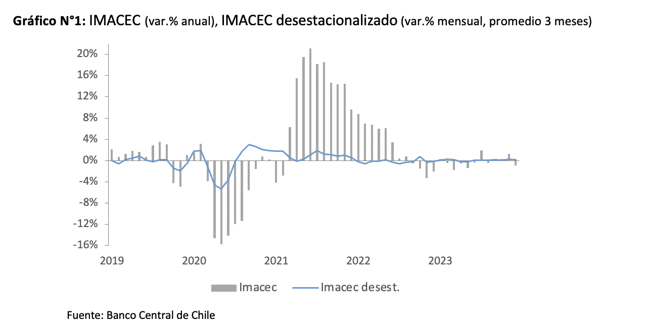 El Banco Central de Chile dio a conocer el IMACEC de diciembre de 2023, el cual disminuyó 1% con respecto a diciembre de 2022, por debajo de lo esperado por el mercado. La serie desestacionalizada, por su parte, cayó 1,1% con respecto al mes previo. Con este resultado el año pasado habría cerrado con una caída anual de -0,2%.