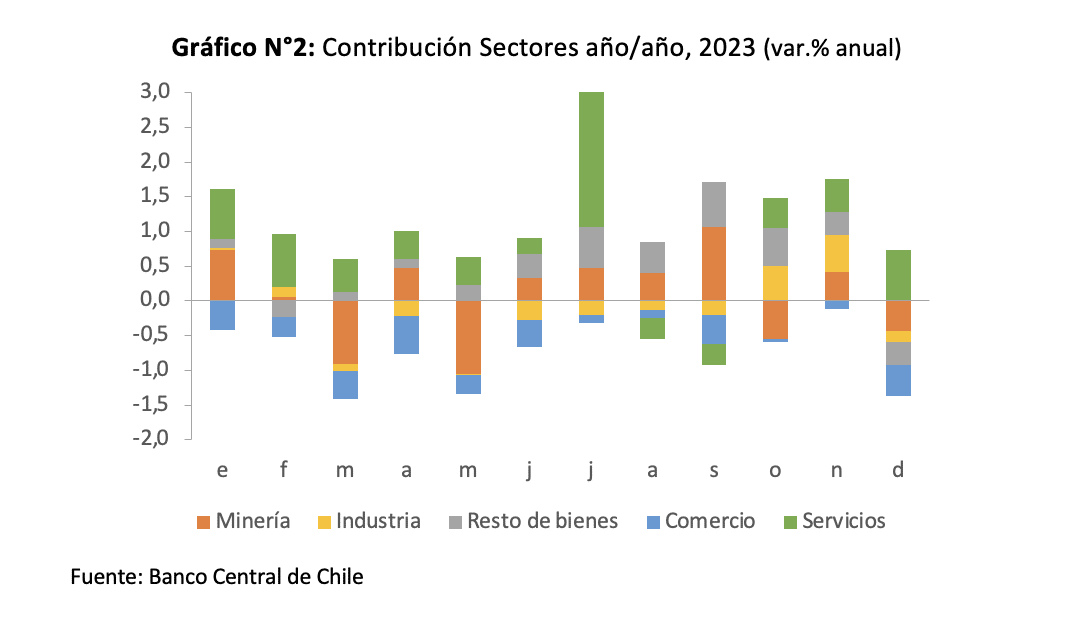 La industria, por su parte, que había logrado cierto repunte en octubre y noviembre, volvió a contraerse en el último mes del año, esta vez en 2,3%. Por último, la minería se redujo 3,6% en términos anuales, de la mano de los datos sectoriales del INE publicados el día de ayer, que mostraron una fuerte baja en extracción y procesamiento de cobre, compensado en parte por la mayor producción de litio.