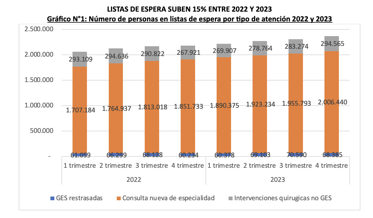 El número de personas en listas de espera subieron un 8,7% entre el cuarto trimestre de 2022 e igual periodo del año pasado, sumando casi 2,4 millones de personas esperando por atención (ver Gráfico N°1).