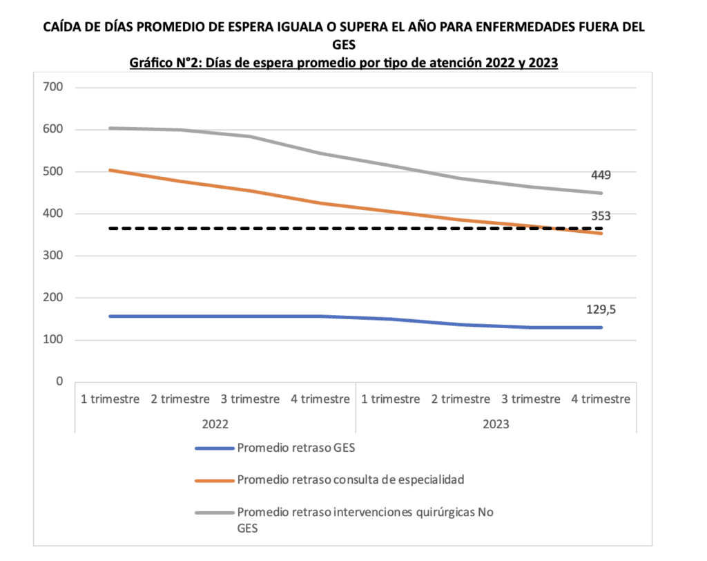 Así, la cantidad de chilenos que esperan por atención llegó a sus máximos históricos y si bien los tiempos de espera han ido consistentemente a la baja siguen siendo muy elevados: en el caso de las intervenciones quirúrgicas que no son parte del GES llega a los quince meses, en las consultas de especialidad bordea el año (línea punteada en el Gráfico N°2) y en las enfermedades que son parte del GES -cuya oportunidad se supone está garantizada por ley- supera los cuatro meses.