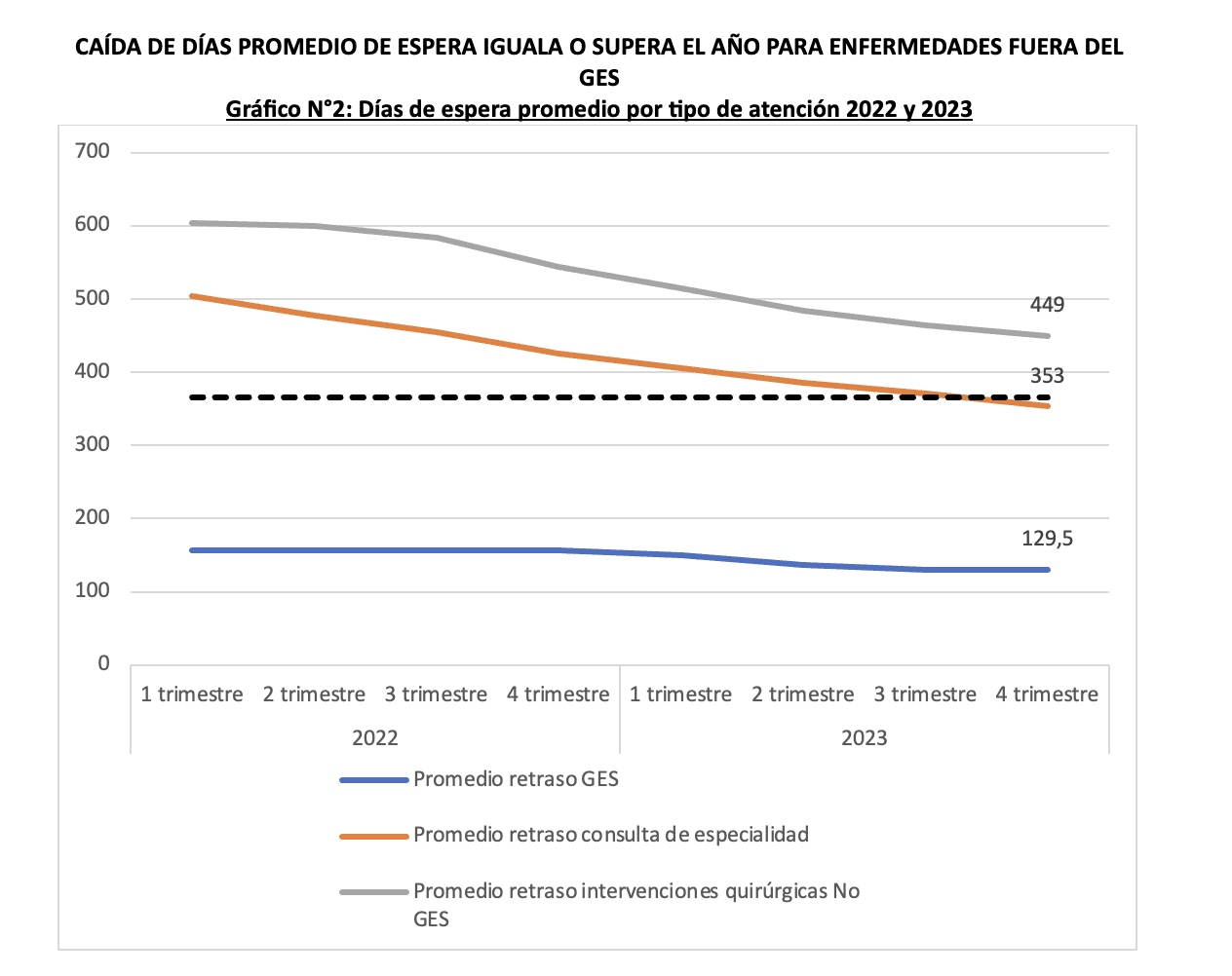 Finalmente, respecto a las personas fallecidas estando en listas de espera. El año 2023 el número de personas fallecidas que esperaban por atención de enfermedades que no son parte del GES fue de 31.772. Esta cifra representa una reducción respecto a los años previos, pero el número total de muertes en lista de espera durante 2023 aún no se conoce porque falta el reporte de los fallecidos en listas de espera GES.