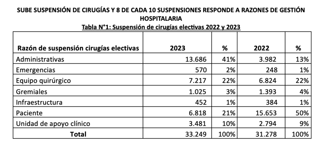 Esto vuelve a relevar la necesidad de fortalecer la productividad de los hospitales del Estado de manera de atender a quienes lo requieren cuando lo necesitan. Las cifras entregadas por el Ministerio de Salud además muestran un importante número de cirugías suspendidas -más de 33 mil durante el año pasado, un alza de 6% respecto a 2022- donde el 80% de las suspensiones es por responsabilidad del hospital (Tabla N°1)