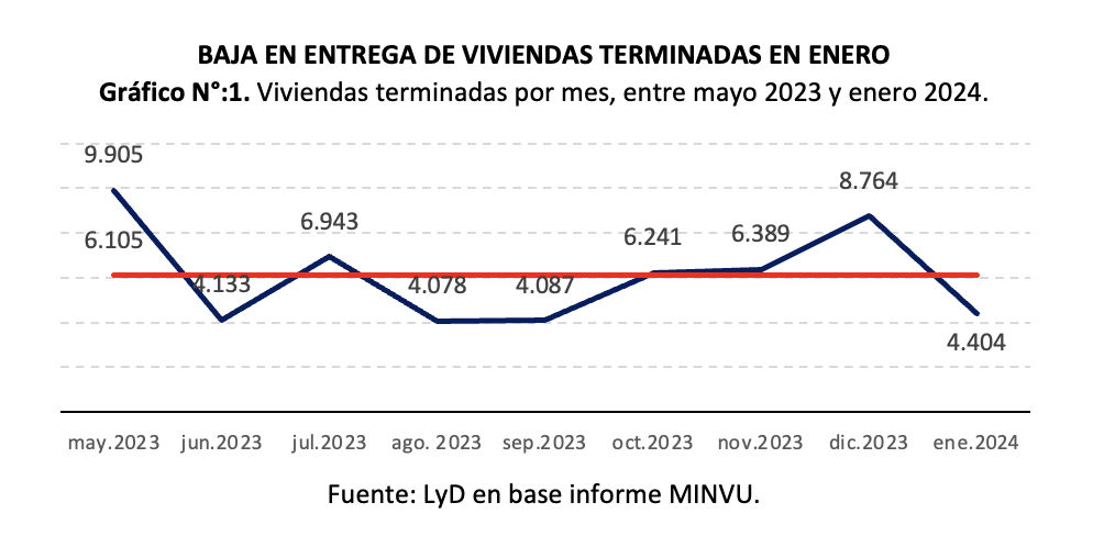 El Ministerio de Vivienda y Urbanismo (MINVU) dio a conocer un nuevo reporte del Plan de Emergencia Habitacional (PEH) y se observa que sólo fueron 4.404 las viviendas terminadas en el enero, menos que el promedio de 6 mil de viviendas por mes (Ver Gráfico N°1). Para realizar este cálculo se diferencia las viviendas terminadas con el mes anterior, en diciembre de 2023 se habían terminado 100.857 viviendas, mientras que en enero 2024 sólo 105.261 viviendas.