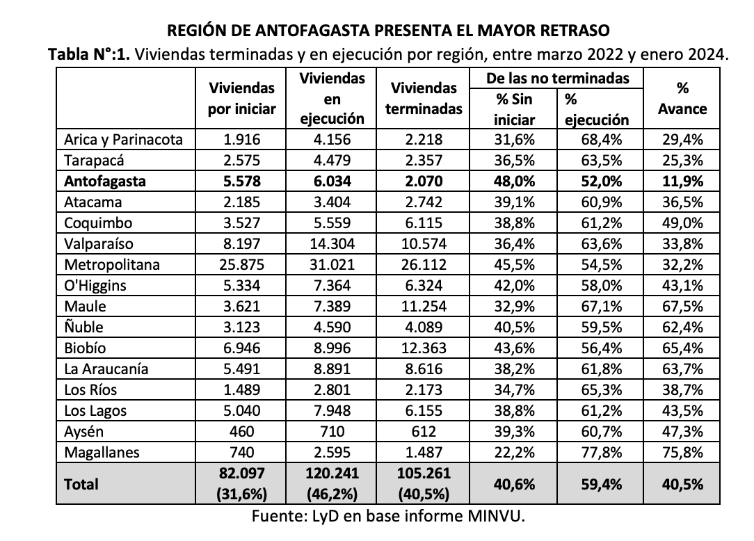 En el reporte se muestra que, al 31 de enero de 2024 este plan presentó un 40,5% de avance, se terminaron 105.261 de 260.000 viviendas. De las que no se han terminado, 120.241 viviendas (un 46,2%) están en ejecución y 82.097 viviendas se encuentran sin iniciar (un 31,6%)[i]. Luego, se observa en la Tabla N°1 que la región de Antofagasta sigue presentando el mayor retraso, un 11,9%.