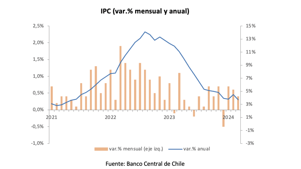 El Instituto Nacional de Estadísticas (INE) dio a conocer el Índice de Precios al Consumidor (IPC) para marzo de 2024, el cual registró una variación mensual de 0,4%, levemente bajo lo esperado por el mercado, acumulando 1,6% en lo que va del año.