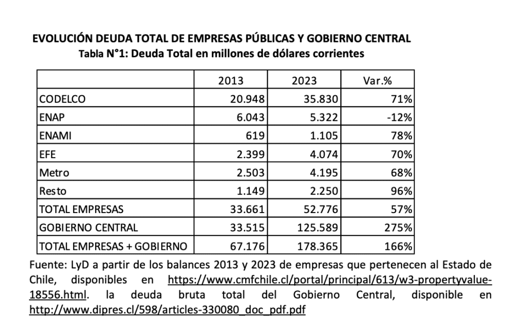 Tal como se aprecia en la tabla anterior, el mayor endeudamiento de las empresas estatales fue menor a lo observado en el Gobierno central, donde el stock de deuda se multiplicó por casi cuatro veces en la década, lo que ha encendido alarma sobre la sustentabilidad de mediano plazo. Así, la deuda total de empresas y Gobierno llega a US$178 mil millones equivalente a un 59% del PIB.