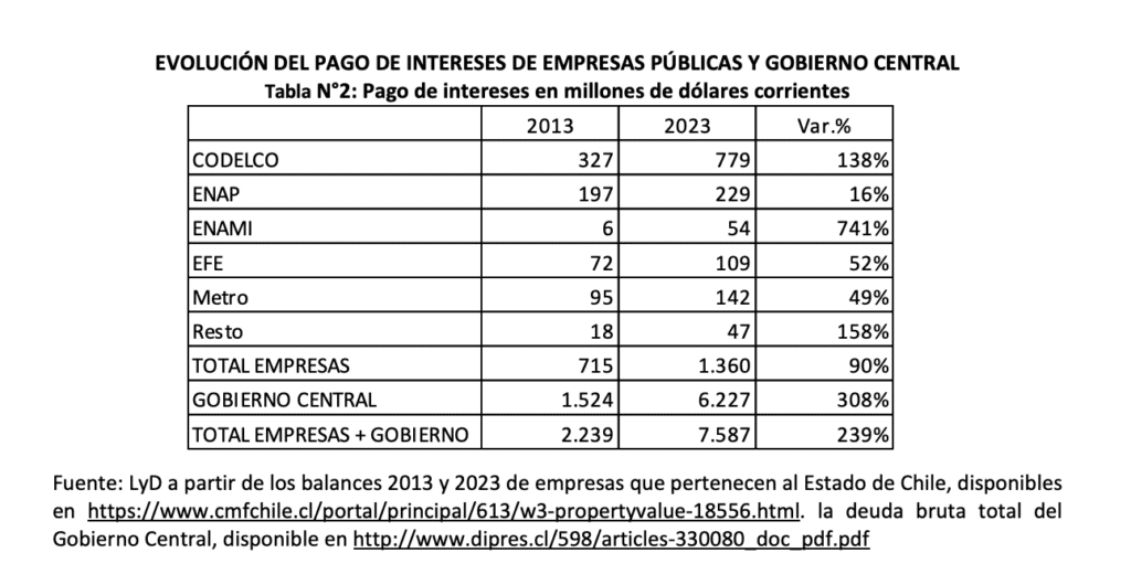 La deuda de CODELCO ha implicado que solo en pago de intereses haya tenido que desembolsar cerca de US$800 millones en 2023, con un incremento de 138% con respecto a lo pagado en 2013. En el resto de las empresas se observan incrementos significativos y solo ENAP logró una expansión más moderada.