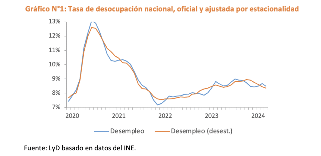 El Instituto Nacional de Estadísticas (INE) dio a conocer las cifras laborales correspondientes al trimestre móvil febrero - abril 2024. Con respecto al trimestre anterior, la tasa de desocupación nacional fue de 8,5%, contrayéndose en 0,2 puntos porcentuales con respecto al mismo período del año anterior. La tasa ajustada por estacionalidad, en cambio, luego de cuatro bajas consecutivas, se mantuvo en 8,4% (Gráfico N°1).