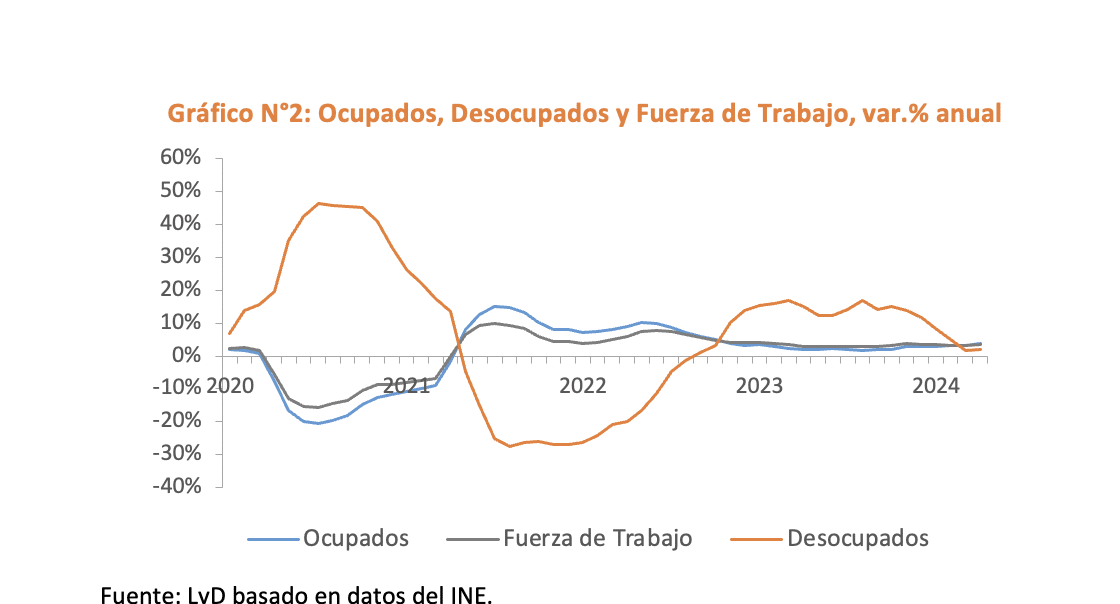 Cabe señalar que la proporción de trabajos privados formales sigue siendo baja. En esta línea, en el trimestre móvil febrero - abril 2024 el 58% corresponde a empleo asalariado privado formal. Preocupa en esta medición el alza exhibida en los trabajadores informales, que aumentaron 7%, por lo que la tasa de informalidad volvió a subir y se situó en 28,2%.