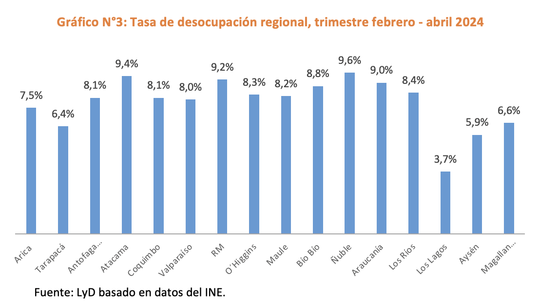 La Región del Ñuble, registra la mayor tasa de desempleo (9,6%), seguido por Atacama (9,4%) y la Región Metropolitana (9,2%), como se observa en el Gráfico N°3. En términos anuales, solo se ven aumentos del desempleo en 6 regiones del país, aunque preocupa la importante alza exhibida en Magallanes (2,5 pp.) y en La Araucanía (2 pp.), al igual que en el trimestre anterior.