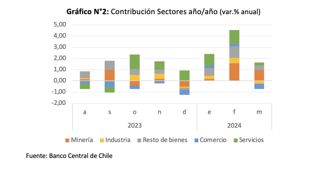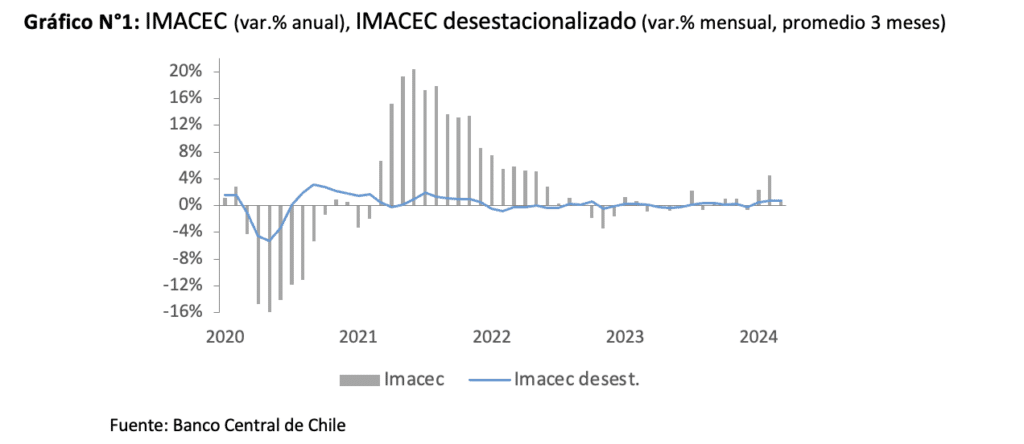 El Banco Central de Chile dio a conocer el Imacec de marzo de 2024, el cual aumentó 0,8% en comparación al mismo mes del año anterior, ubicándose en el rango bajo de las proyecciones. A pesar de que marzo tuvo tres días hábiles menos que en 2023, la serie desestacionalizada cayó 0,7% con respecto a febrero, con aportes negativos de todos los sectores.