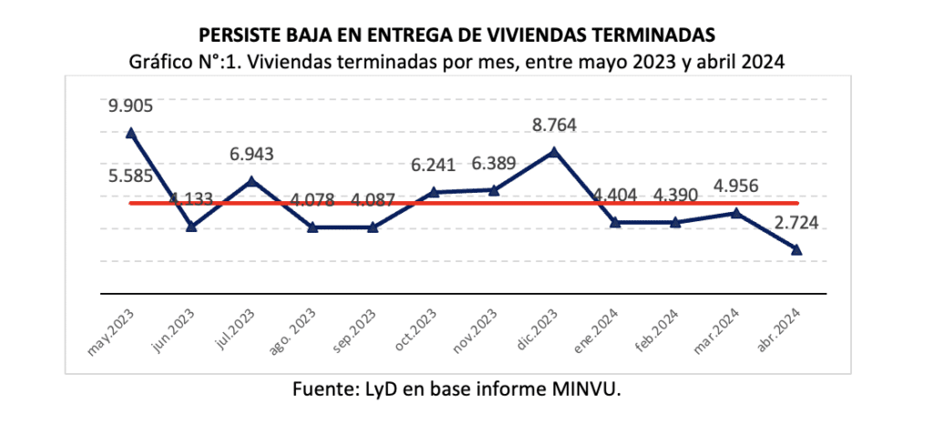 El Ministerio de Vivienda y Urbanismo (MINVU) dio a conocer un nuevo reporte del Plan de Emergencia Habitacional (PEH) del mes de abril. En abril sólo fueron terminadas 2.724 viviendas, menos que el promedio de casi 5,6 mil de viviendas por mes (Ver Gráfico N°1). Para realizar este cálculo se diferencia las viviendas terminadas con el mes anterior, en marzo de 2024 se terminaron 114.607 viviendas, mientras que en abril 2024 sólo 117.331 viviendas.