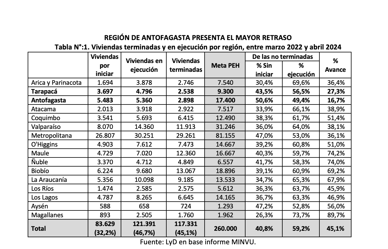 El reporte muestra que este Plan presentó un 45,1% de avance al 30 de abril de 2024. Se terminaron 117.331 de 260.000 viviendas. De las que no se han terminado, 121.391 viviendas (un 46,7%) están en ejecución y 83.629 viviendas sin iniciar (un 32,2%)[i]. Luego, se observa en la Tabla N°1 que la región de Antofagasta sigue presentando el mayor retraso, un 16,7%.